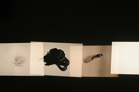 Gleichzeitig werden in der Installation das reale Objekt im Diaglasrahmen, eine Projektion des Objektes und ein Abbild in Form von Fotogrammen gezeigt.